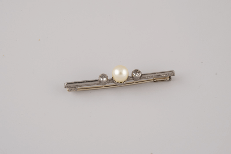 Otra opción puede ser añadir joyas a nuestro abrigo o bufanda. Por ejemplo, este fino broche del segundo tercio del siglo XX, compuesto por oro blanco y decorado con una perla cultivada en el centro, flanqueada por dos diamantes, aportará un brillo especial a tu mirada si lo colocas cerca del rostro.