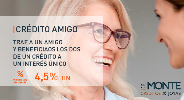 Sólo tienes que presentarte con tu amiga o amigo en una oficina de elMONTE trayendo vuestras joyas y explicando que quieres disfrutar de la promoción “Crédito Amigo”. Nuestros compañeros tasadores te identificarán como cliente y a continuación verificarán que tu amigo no es cliente. Llevarán a cabo la valoración de la joya de tu amigo y en el caso de que decida contratar el crédito, este se formalizará aplicando un interés del 4,5% TIN para TODA LA VIDA del préstamo. A continuación, y cuando el crédito de tu amigo haya sido formalizado, se procederá a tasar tu joya y a dar de alta tu NUEVO crédito en las mismas condiciones del 4,5% TIN.
